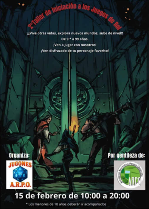 Recordad que el próximo domingo 15 de febrero estamos todos invitados a participar en el «2º TALLER DE INICIACIÓN A LOS JUEGOS DE ROL» que organiza ARPO (Asociación Recreativa Parque Ondarreta) en horario de 10:00 h a 20:00 h.